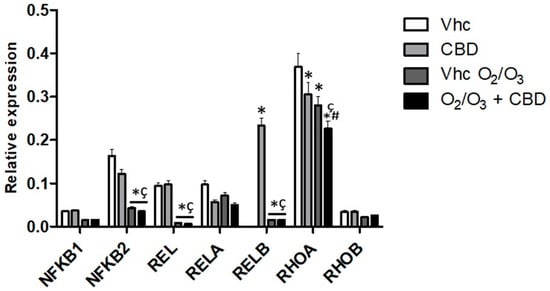 Modulation of NF-kB pathways in PANC-1 cell line. NFKB1, NFKB2, REL, RELA, RELB, RHOA, and RHOB mRNA expression was evaluated by qRT-PCR in the PANC-1 cell line, treated with CBD in the presence and absence of O2/O3. Target mRNA levels were normalized for GAPDH expression. Data are expressed as fold mean ± SE. * p < 0.05 vs. Vhc, #,* p < 0.05 vs. Vhc O2/O3, ç p < 0.05 vs. CBD.