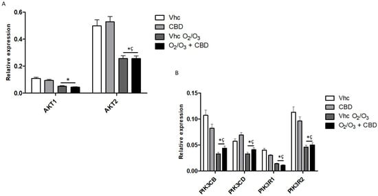 Regarding Phosphatidylinositol 3-kinase/Protein kinase B (PI3K/AKT) pathway, CBD did not significantly modulate the expression of the main genes. Indeed, it induced a slight increase in PIK3CD and only PIK3CB, PIK3R1 and PIK3R2 were reduced. (Figure 14, Figure S10A). O2/O3 treatments reduced the expression of all analyzed genes compared with vehicle-treated cells (Figure 14B, Figure S10B), and the combination with CBD maintained the effect of O2/O3 (Figure 14, Figure S10).