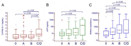 Serum levels of CYFRA 21-1, AFP, and PIVKA-II were determined on the fully automated chemiluminescent enzyme immunoassay (CLEIA) system Lumipulse® G600 II (Fujirebio Inc., Tokyo, Japan) using Lumipulse® G CYFRA, Lumipulse® G AFP-N, and Lumipulse® G PIVKA-II reaction cartridges, according to manufacturer’s instructions. CYFRA 21-1 and AFP concentrations were given in ng/mL, while PIVKA-II values were reported in mAU/mL []. Detection limit of CYFRA 21-1, AFP, and PIVKA-II assays were 0.5 ng/mL, 0.075 ng/mL, and 1.37 mAU/mL, respectively.