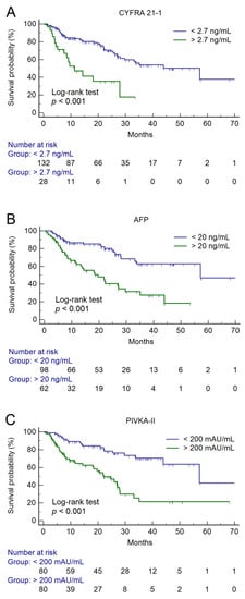 Survival curves according to baseline values of CYFRA 21-1 (A), AFP (B), and PIVKA-II (C). Abbreviations—alpha-fetoprotein (AFP) and protein induced by vitamin K absence or antagonist II (PIVKA-II).