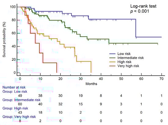 Median OS was 70.5, 95% CI 57.2–70.5 months for the low-risk group, 34.9, 95% CI 25.9–43.9 months for the intermediate risk group, 18.4, 95% CI 8.4–27.1 months for the high-risk group, and 7.5, 95% CI 4.0–11.3 months for the very high-risk group. Multivariate adjusted HRs for OS of the four risk categories are described in Table 3. As compared with the low-risk category, both the intermediate, high-risk, and very high-risk categories were significantly associated with a progressively higher likelihood of death.