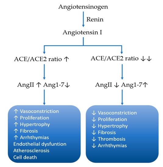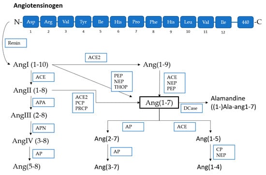 The Mas receptor binds angiotensin 1–7 and shows opposite effects of the classical effects of ACE-angiotensin II/AT1. Ang 1–7 is produced by the angiotensin-converting enzyme II, with Ang II as a major substrate. Under physiological circumstances the Mas/Ang 1–7 pathway can be seen as a regulator of the AT1/angiotensin II pathway []. Therefore, it has anti-fibrotic, anti-proliferative and anti-hypertrophic properties. In mouse models high dose Ang 1–7 was capable of antagonizing the Ang II effect on blood pressure []. In reality, the ACE2/Ang1–7/Mas axis has broader actions, but the complexity of the whole renin–angiotensin–aldosterone system (RAAS) homeostasis and its actions is very impressive and exceeds the aim of this review (Figure 1 and Figure 2). Figure 1 shows the angiotensin homeostasis dependent on the balance between ACE and ACE2 and their consequential effect on the AngII and Ang1–7 equilibrium, thus emphasizing the effect of a shift in this balance, considering fibrosis arrhythmias, vasoconstriction, proliferation hypertrophy, etc. Figure 2 summarizes the cleavage pathways for angiotensinogen, underlining the complexity with multiple involved enzymes and numerous intermediate products.