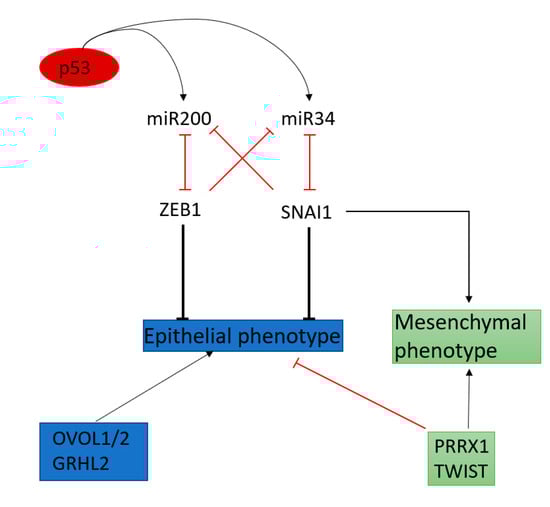 The regulation of the EMT-TFs does not only involve proteins, but also miRNAs (see Figure 5) which have either negative or double negative (i.e., positive) feedback loops, as shown in Figure 5 [,].