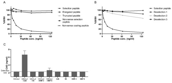 Specificity of the C4G monoclonal antibody. The monoclonal antibody’s reactivity in the competitive C4G ECLIA was tested toward (A) the selection peptide (MGNTGPTGAV), an elongated peptide (FMGNTGPTGAV), a truncated peptide (GNTGPTGAV), a non-sense selection peptide (LLARDFEKNY), and a non-sense coating peptide (LLARDFEKNY-K-biotin) and (B) the selection peptide (MGNTGPTGAV) and the deselections peptide 1 (MGQTGPTGAV), 2 (MGNSGPTGAV), and 3 (QGNTGPTGAV). %B/B0: B equals the intensity of a sample well (OD at x ng/mL peptide) and B0 equals the maximum intensity (OD at 0 ng/mL peptide). (C) The α2 chain of type IV collagen was incubated for 24 h without or with the serine proteases granzyme B (GzB) or neutrophil elastase (NE), or the matrix metalloproteinases (MMPs) MMP-2 or MMP-9. The buffer added proteases alone were included as negative controls. Data is based on two independent experiments and presented with mean and standard deviation. The dotted line represents the lower limit of measurement.