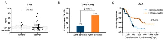 We first assessed the association between C4G levels and the objective response rate (ORR). C4G was slightly elevated in patients with CR and PR (28.0 ng/mL) compared to patients with SD and PD (20.6 ng/mL) (p = 0.157) (Figure 2A), although no statistically significant difference was found. Most of the patients with CR and PR had C4G levels above the reference limits of healthy individuals whereas the patients with SD and PD had C4G levels below, within, or above the reference limits. As the majority of responding patients (CR + PR) had C4G levels above the 25th percentile, the C4G biomarker levels were dichotomized by the 25th percentile cut-point. The ORR was 2.6-fold higher (18% vs. 7%) in patients with high C4G levels (>25th percentile) compared to low levels (≤25th percentile) (p = 0.031) (Figure 2B).