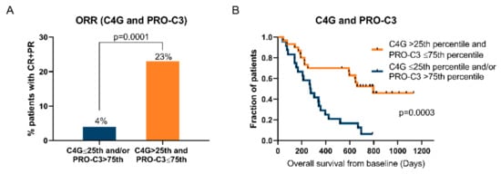 Patients with high C4G and low PRO-C3 levels have a better chance of responding. (A) The objective response rate (ORR) in metastatic melanoma patients with high C4G (>25th percentile) and low PRO-C3 (≤75th percentile) levels at baseline were compared to patients with low C4G and/or high PRO-C3 levels with Fisher’s exact test. (B) Overall survival for the same groups of patients was analyzed by Kaplan–Meier curves and a log-rank test. A p-value of p < 0.05 was considered statistically significant.