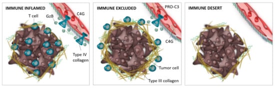 Hypothetical illustration showing how the ECM-derived biomarkers may associate with cancer-immune phenotypes. (Left) During T-cell infiltration into the tumor microenvironment, T cells release granzyme B (GzB) to break down type IV collagen to pass through the basement membrane which may result in released fragments of granzyme B degraded type IV collagen (C4G) into the circulation. In the immune-inflamed phenotype, many of these T cells are positioned in the tumor parenchyma, while in the immune-excluded phenotype (Middle), the T cells are retained in the high-density collagen barrier that may release type III collagen fragments into the circulation (PRO-C3). (Right) In the immune-desert phenotype, few or no T cells are found in the tumor microenvironment.