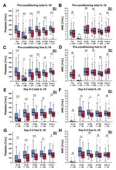 Median platelet and neutrophil counts pre-conditioning and at different time-points following alloSCT in patients with low versus high pre-conditioning and day 0–3 total and free IL-18 levels (training cohort). (A,B) Median platelet and neutrophil counts, respectively, in patients with low versus high pre-conditioning total IL-18 levels. (C,D) Median platelet and neutrophil counts, respectively, according to pre-conditioning free IL-18 levels. (E,F) Median platelet and neutrophil counts, respectively, in patients with low versus high day 0–3 total IL-18 levels. (G,H) Median platelet and neutrophil counts, respectively, according to day 0–3 free IL-18 levels. The first (Q1) and fourth quartile (Q4) of the total IL-18 and free IL-18 distribution was used to stratify patients in low and high IL-18 groups. Corresponding patient numbers are given (n = Q1 + Q4). Mann–Whitney U test, * p < 0.05, ** p < 0.01, *** p < 0.001, ns = not significant.