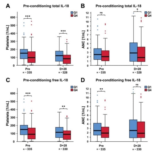 Median platelet and neutrophil counts pre-conditioning and at day +28 following alloSCT in patients with low versus high pre-conditioning total and free IL-18 levels (confirmation cohort). (A,B) Median platelet and neutrophil counts, respectively, in patients with low versus high pre-conditioning total IL-18 levels. (C,D) Median platelet and neutrophil counts, respectively, according to pre-conditioning free IL-18 levels. The first (Q1) and fourth quartile (Q4) of the total IL-18 and free IL-18 distribution was used to stratify patients in low and high IL-18 groups. Corresponding patient numbers are given (n = Q1+Q4). Mann–Whitney U test, * p < 0.05, ** p < 0.01, *** p < 0.001, ns = not significant.