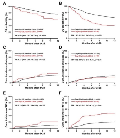 Outcome of allografted patients in the first year post-landmark stratified according to day +28 platelet counts in the training cohort and in confirmation cohort. (A) In the training cohort (n = 653), platelets ≤20/nL at day +28 were associated with lower probability of overall survival (OS) with the first year after day +28. (C) Platelets ≤20/nL at day +28 were not correlated with incidence of relapse in the training cohort. (E) In contrast, platelets ≤20/nL at day +28 were associated with a significantly increased cumulative incidence of non-relapse mortality (NRM) in the training set. (B,D,F) In the confirmation cohort (n = 652), a comparable association of platelet counts <20/nL with worse OS, due to a higher incidence of NRM rather than relapse, was observed. Note: Patients who experienced relapse within the first 28-day post-transplant were excluded from the analysis. Abbreviations: CI, confidence interval; HR, hazard ratio; OS overall survival, NRM, non-relapse mortality.
