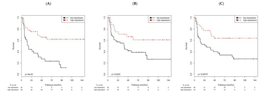 Kaplan–Meier analysis of the association of CXCL9, PD1 or PD-L1 mRNA with RFS. Gene expression was significantly associated with RFS for the genes. (A): CXCL9 (p < 0.001). (B): PD1 (p = 0.023). (C): PD-L1 (p = 0.007).