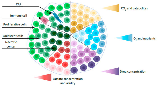 Simplified representation of a spheroid with different layers (proliferative outer layer, a quiescent intermediate layer, and the necrotic center) and gradients (oxygen, nutrients, CO2, catabolites, and drug concentration). Co-culture spheroid is represented by the addition of cancer-associated fibroblast (CAF) and immune cell.