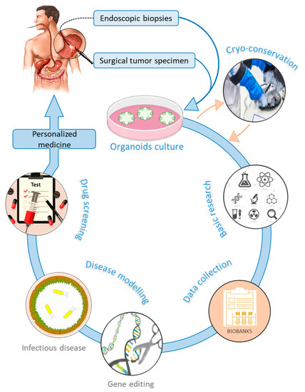 Gastric organoids can be established from normal and cancerous gastric tissues. They are embedded into an ECM (matrigel) in a manner that recapitulates 3D in vivo conditions [129,131]. Methods used for culturing organoids from normal tissues have been adapted to successfully produce organoids from several human cancers [132]. PDTO can be propagated from surgical tumor specimens or endoscopic biopsies [133] (Figure 2). In general, protocols used to culture gastric organoids start from rinsing and mincing tumor tissues into small pieces (2–5 mm3). Released tumor cells from bulk tissues are then resuspended in matrigel [134] and overlaid with culture medium supplemented with essential components such as epidermal growth factor (EGF), noggin, R-spondin1, Wnt, fibroblast growth factor (FGF), gastrin, transforming growth factor (TGF), nicotinamide, insulin-like growth factor (IGF), and p38 inhibitor glycogen synthase kinase (GSK) [135]. These supplements make organoids culture environments very complex and different from conventional 2D culture media, which may limit strict comparisons in cell behavior. Gastric organoids tend to have a conserved architecture, with gastric glands budding around a central lumen [39]. However, contamination by epithelial and stromal cells, as well as the scarcity of cancer cells, represent a major challenge in culturing PDTO [130,136]. Primary PDTO appear like a mosaic of normal and cancer cells. Mechanical or enzymatic disruption allows passing organoids to maintain the culture for many months and even be cryo-preserved. In addition, PDTO biobanks were created either from primary [131,137] or metastatic tumors [138]. These biobanks offer a biological access to human GC, facilitate drug screening, validate biomarkers, and enable personalized medicine. However, statistical issues are raised, since too small a repertoire of banked cells might not be representative enough of the genetic heterogeneity of GC.