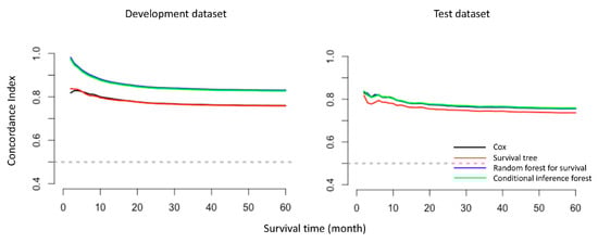 | Random forest for survival (RF) | 0.83 (0.83, 0.83) | 0.76 (0.76, 0.76) |