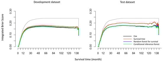 - Mogensen, U.B.; Ishwaran, H.; Gerds, T.A. Evaluating random forests for survival analysis using prediction error curves. J. Stat. Softw. 2012, 50, 1–23. [Google Scholar] [CrossRef]