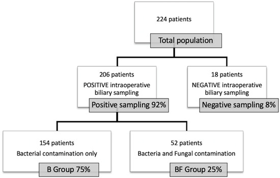 To such end, of the 224 patients included, 18 patients (8%) with negative bile culture were excluded of the final analysis. The remaining 206 patients were distributed into two groups as follow: B group, exclusive bacterial contamination with 154 patients (75%); BF group, combined bacterial and fungal contamination with 52 patients (25%) (Figure 1).