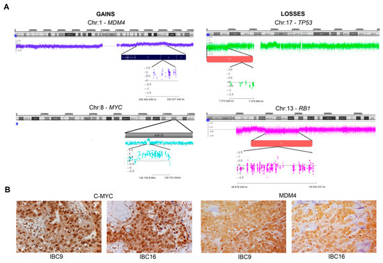 (A) Chromosomal location of some of the most common genes covered by gains (MYC and MDM4) and losses (RB1 and TP53) in inflammatory breast carcinomas. (B) Representative examples of high expression of C-MYC and MDM4 proteins in two cases (IBC9 and IBC16) that also showed MYC and MDM4 gains in the microarray analysis. It is possible to observe diffuse C-MYC and MDM4 expression in both cases. Hematoxylin counterstaining, 400×.