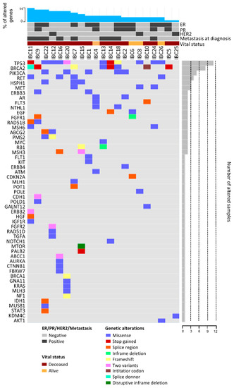 OncoPrint showing the 53 genes affected by mutations in the 21 IBC patients evaluated by targeted next-generation sequencing (tNGS). Patients from left to right present a decreased number of mutations (top panel), while genes from top to bottom were found mutated in a decreasing number of patients (right panel).
