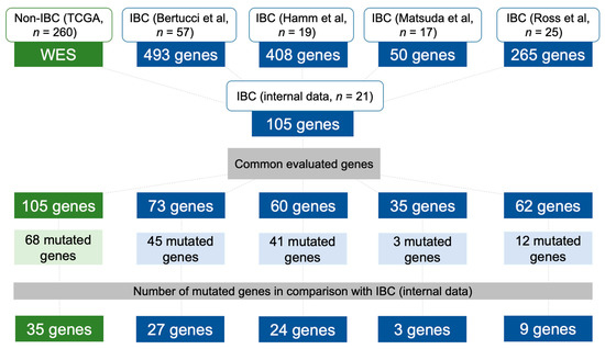 Diagram showing the datasets used to compare the mutational profile of non-IBC and IBC cases with our IBC patients. The total number of genes evaluated by each study, the number of genes in common in relation to our study, the mutated genes per study, and the number of common mutated genes compared to our cases are depicted. WES: whole-exome sequencing.