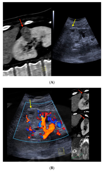 Modern high-end ultrasound devices allow for the integration and adequate reconstruction of previously performed CT or MRI scans, thereby enabling simultaneous and real-time computerized fusion of former cross-sectional studies with live ultrasound images in the same and additional planes [12,13]. Fusion imaging depicts an innovative technique by which the assets of combined imaging modalities, such as comprehensive field of view and high-contrast resolution of CT/MRI, and high spatial resolution of ultrasound in real-time, can be complemented and restrictions can be minimized, e.g., the limited acoustic window of ultrasound is extended by the wide field of view of CT and MRI [14]. Of note, fusion imaging can be conducted with native B-mode, Color Doppler, CEUS, and elastography, which facilitates thorough and dynamic scrutiny of focal parenchymal lesions of interest [15]. The visualization of tissue and tumoral microperfusion by CEUS can be dynamically fused and analyzed with images from previous cross-sectional studies, thereby further elevating the confidence of the observer. Of note, compared to elaborate cross-sectional imaging modalities, CEUS and advanced fusion imaging are easily accessible and repeatable, comparably inexpensive, and have an excellent safety profile [7]. By using fusion imaging, the ultrasound examination depends less on the capability of the observer to mentally fuse findings from previous CT/MRI scans with recent sonographic findings. The advantage of using fusion imaging to ablate liver lesions and to monitor subsequent therapeutic outcome was already described [16,17,18]. Furthermore, fusion imaging of CEUS and CT was shown to help the placement of endovascular aortic repair (EVAR) and further improve the visualization of graft endoleaks [19,20].
