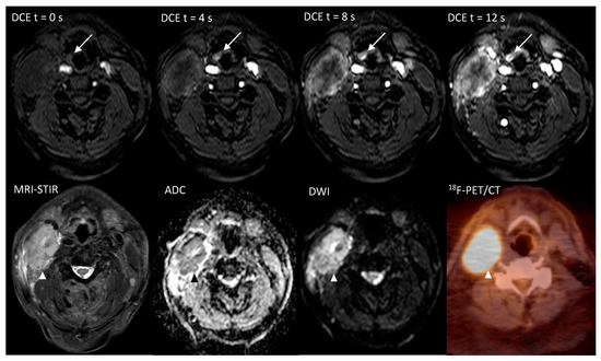 Imaging of a 71-year-old patient, with a hypopharyngeal (epiglottal) primary tumor detected only on the ultrafast-DCE imaging (arrow), whereas DWI and 18F-FDG-PET/CT did not detect the lesion. The overt malignant lymph node metastasis is marked with an arrowhead (Δ).