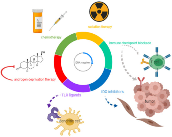 Although Sip-T has shown a significant but arguably modest effect in the treatment of mCRPC, and could theoretically be combined with other agents, the cost associated with this treatment makes it less accessible to the majority of patients and makes combination approaches potentially prohibitively costly [26]. DNA vaccines are significantly cheaper, can be used off-the-shelf, and several have already been approved for use in veterinary medicine [27]. Many therapies that are currently in use and in development also have immunomodulatory effects, which can be leveraged to further enhance the antitumor efficacy of DNA vaccines. Combining DNA vaccines with other therapies is consequently a valid approach for the treatment of mCRPC, and these combinations will be the focus of this review.