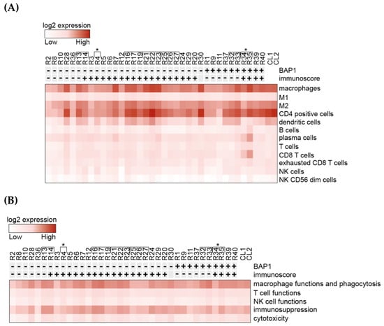 Heatmaps generated from normalized data post-NanoString analysis of gene expression. All metastatic uveal melanoma (mUM) cases were sorted by nuclear BAP1(nBAP1) status and total immunoscore (previously described, where total immunoscore of “0–3” i.e., “cold” tumours are shown as “-” and “4–6” i.e., “hot” tumours are marked “+.”) (A) Analysis of the relative participation of immune cell types/cell type profiling within the mUM tumour microenvironment. (B) Analysis of the gene profiles characteristic for the indicated cell functions. Key: [ indicates tumours from the same patient. *R4, R34, and R35 were samples from the same patient, with a 6-year difference between the two metastasectomies. CL1 is control liver samples pool 1 and CL2 is control liver samples pool 2. (Lists of genes included in each category for (A) and (B) are available in Figure S3A,B, respectively (as defined by NanoString, Figueiredo et al. [26] and Waks et al. [31])).