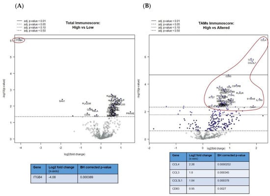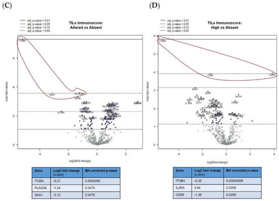 The abovementioned decrease in ITGB4 expression was also observed in the comparison of mUM with “altered versus absent” TIL scores (adjusted p < 0.01) (Figure 2C) and “high versus absent” TIL scores (adjusted p < 0.01) (Figure 2D). Other genes that were downregulated in the TIL “high” mUM were PLA2G6, SAA1, and CD99 (adjusted p < 0.05 for all), whereas CD25/IL2RA (Treg marker) was upregulated (adjusted p < 0.05) (Figure 2C,D and Table S2C,D).
