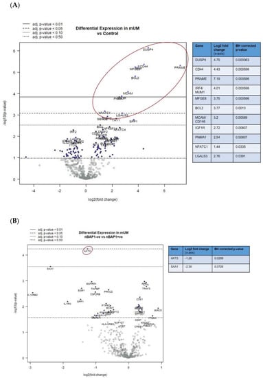 Differential gene expression profiles presented as volcano plots for: (A) all mUM versus control liver and (B) nBAP+ve mUM versus nBAP-ve mUM. The log2 fold changes with cut-offs for adjusted p-values are shown. The genes of interest (marked fold changes and statistically significant) are highlighted (red outline and inset table). (Table S3 gives more detailed output for each gene).