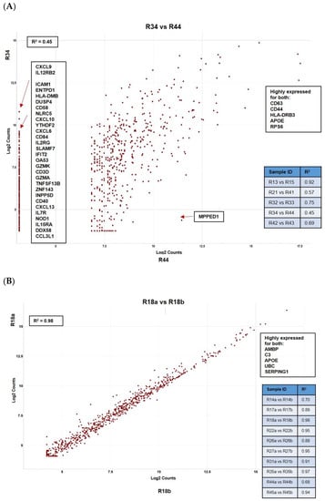 Pairwise ratio comparisons of normalized data demonstrating: (A) intersegmental heterogeneity for hepatic mUM taken from the same patient where marked difference in a number of immune-related genes was noted and (B) between two histomorphologically distinct areas within the same tumour deposit (intratumoural analysis) showing lack of transcriptomic variability. All results are presented as scattered plots with the “R2” coefficients given for each of the comparisons. Genes consistently highly expressed between samples are highlighted.