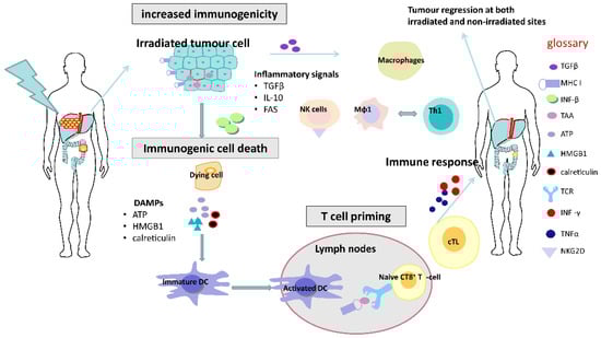 RT is well documented to initiate tumour rejection by enhancing anti-tumour immune responses, although mostly in murine tumours [10,11,12,13,14,15,16]. The phenomenon “abscopal effect”, which refers to a tumour in a non-irradiated site regressing after RT [17], offers further evidence of the ability of RT to induce immunological responses. RT can mediate these effects in several ways including immunogenic effects on tumour cells and immunostimulatory effects on the immune system.