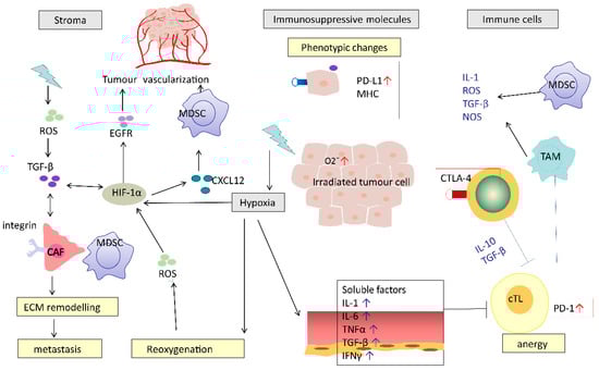 Irradiated normal tissue adjacent to tumour undergoes a process of inflammation, wound healing and fibrosis. This process involves the expansion of cancer-associated fibroblasts (CAFs) and extracellular matrix modelling, which leads to post-radiation tumour hardening and shrinkage, and ultimately facilitates tumour spread or recurrence [26]. CAFs are a heterogeneous cell population that constitute the majority of cells within the stroma in many carcinomas [28]. RT activates CAFs by causing DNA damage and production of ROS [29]. Irradiated CAFs can contribute to cancer progression via the transforming growth factor beta (TGF-β)-CXCL12 dependent pathway. However, whether CAFs play a tumour-killing or tumour-promoting role may vary depending on the type of signal [30]. RT-induced vascular damage is aggravated by tumour hypoxia through CXCL-12 and HIF-1α-mediated MDSC recruitment [31].