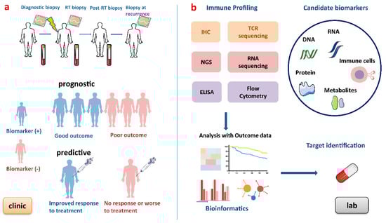 Process of developing biomarkers for patients undergoing radiotherapy. (a) Blood and tumour biopsies are taken at baseline, during RT, after RT and at recurrence to obtain dynamic immune profiling. This figure shows an ideal example of prognostic and predictive biomarkers. Prognostic biomarkers provide information on disease progression and outcomes, and predictive biomarkers indicate the response to a medical intervention. (b) In the lab, these biomarkers can be discovered by high-throughput gene technologies, immune-based technologies and analysed by bioinformatic approaches. RT, radiotherapy; IHC, immunohistochemistry; NGS, next-generation sequencing; TCR, T cell receptor; ELISA, enzyme-linked immunosorbent assay.