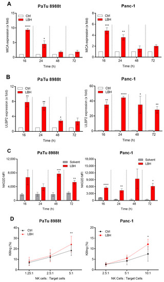 NKG2D ligand expression in PaTu 8988t and Panc-1 cells after treatment with HDACi LBH589. The mRNA of NKG2D ligands (A) MICA and (B) ULBP2 was measured in PaTu 8988t (left panel) and Panc-1 (right panel) 16, 24, 48 and 72 h after treatment with 100 nM LBH58th 25 nM LBH for up to 72 h and NKG2D-L and the mean fluorescence intensity (MFI) was measured by flow cytometry using recombinant human NKG2D Fc chimera protein. (D) Tumor cells were treated with 100 nM LBH589 for 16 h before they were co-cultured with primary NK cells for 3 h and NK cell-mediated killing of target cells was measured by flow cytometry. Data are the mean of three (A,B,D) or four to five independent experiments (C) ± SEM. Statistical significance between treated and untreated samples of the individual time points was calculated using Student’s t-test (* p < 0.05, ** p < 0.01, *** p < 0.001, **** p < 0.0001).