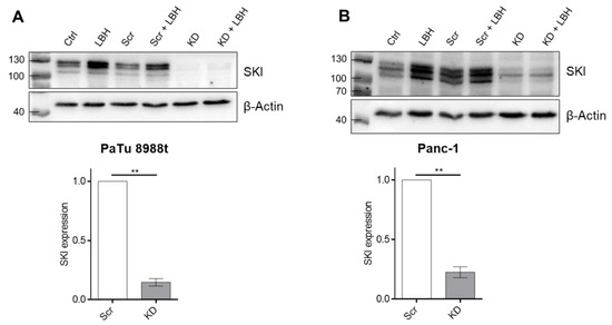 siRNA-mediated knockdown (KD) of SKI. (A) PaTu8988t and (B) Panc-1 cells were treated with siRNA for SKI knockdown for 24 h followed by 16 h of 100 nM LBH589 treatment before the knockdown was quantified by Western Blot analysis. Ctrl: non treated, scr: scrambled siRNA. The lower panel depicts the quantification of qRT-PCR data for scrambled siRNA-treated sample and siRNA treated samples. Data are the mean of three independent experiments ± SEM. Statistical significance was calculated using Student’s t-test (** p < 0.01). KD = knockdown, Scr = scrambled.