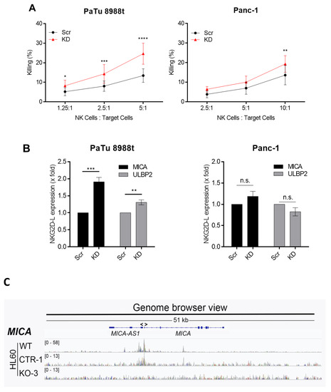 Effect of SKI knockdown on NK cell-mediated killing of target cells and expression of NKG2D-L. (A) SKI knockdown was performed in PaTu89888t (left panel) and Panc-1 (right panel) cells for 24 h. Then, cells were co-cultured with primary NK cells for 3 h before target cell killing was measured by flow cytometry. (B) The mRNA expression of NKG2D-L MICA and ULBP2 was measured in SKI knockdown cells. Data are the mean of four (3B) to five (3A) independent experiments ± SEM. Statistical significance was calculated using 2-way ANOVA and Sidak’s multiple comparisons test (3A) and Student’s t-test (3B) (* p < 0.05, ** p < 0.01, *** p < 0.001, **** p < 0.0001, n.s.: not significant). (C) Genome browser view of the MICA genomic region of the SKI ChIPseq analyses of the cell line HL60 (WT), HL60 control cells (CTR-1, CRISPR-Cas9) and HL60-SKI deficient cells (KO-3, CRISPR-Cas9).