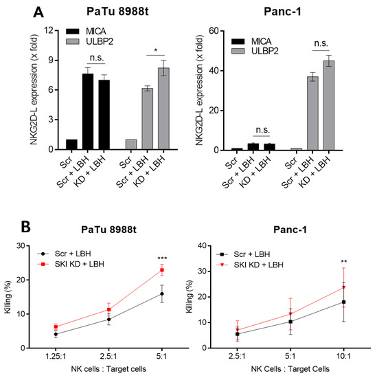 Next, both SKI wildtype and SKI knockdown cells were treated with LBH and the impact on the inducible expression of MICA and ULBP2 was analyzed by qRT-PCR. Interestingly, we observed in knockdown cell lines a significantly higher induction of ULBP2 transcription, which was in line with enhanced NK cell-dependent killing of PaTu8988t cells (Figure 4A,B). These data suggest that SKI interferes with the HDACi-dependent ULBP2 upregulation on these pancreatic cancer cells. However, the HDACi-dependent induction of MICA remained unaltered in SKI wildtype cells and upon knockdown (Figure 4A). LBH-treated SKI-deficient Panc-1 cells were more efficiently killed than wildtype cells. However, no significant upregulation of ULBP2 or MICA could be detected, suggesting that SKI suppresses NK cell immunosurveillance also by NKG2D/NKG2D-L-independent mechanisms.