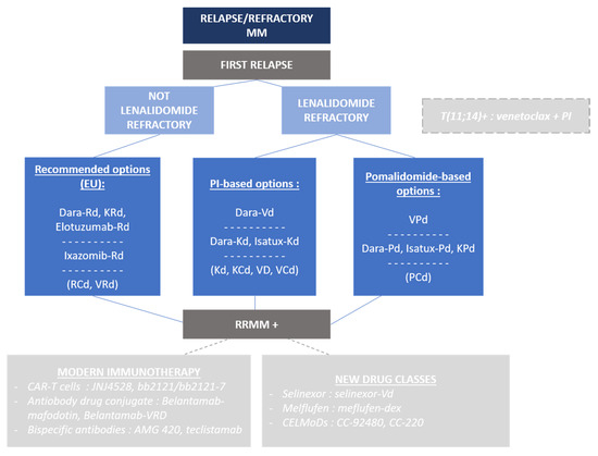 Not IMiD/lenalidomide refractory (progression under treatment or <60 days after the end of treatment). A triplet association with lenalidomide is probably the better option. To date, as still only few patients would have received daratumumab, the triplet dara-Rd is a valid choice based on the data of the phase 3 POLLUX trial, with an impressive median PFS of 45.8 months for dara-Rd vs. 17.5 month for Rd (p < 0.0001) [26], and a ≥CR rate of 57% vs. 24%, respectively. Interestingly, dara-Rd also performed well for patients exposed to lenalidomide, although it concerned a quite small cohort of patients (n = 50). Another compelling option is carfilzomib associated to Rd (KRd) as introduced in the ASPIRE trial. The median PFS with KRd was 26.3 months vs. 17.6 months (p = 0.0001) [27], and the median OS in the final analysis was 48.3 months for KRd versus 40.4 months for Rd (p = 0.0045) [28]. Other possible options include combinations such as elotuzumab-Rd and ixazomib-Rd; median-PFS 19.4 months in the ELOQUENT-2 trial (p = 0.001) [29] and 20.6 months in the phase 3 TOURMALINE-MM1 trial (p = 0.0012) [30]. Indeed, we will not mention, in this review, Rd, RCd, VRD, etc., which are obviously valid options but mostly used in first-line responses.