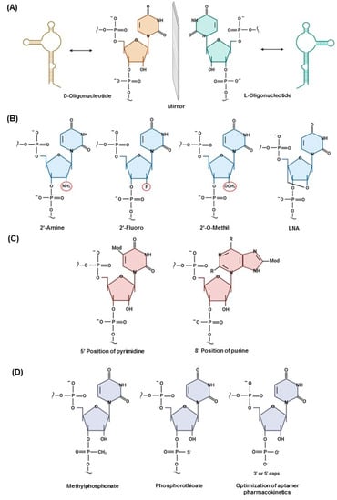 Post-Systemic Evolution of Ligands by Exponential enrichment (SELEX) modifications. (A) Spiegelmers aptamer strategy: chiral inversion transition resulting in mirror image. (B) Modifications of the sugar ring: replacement of 2′ positions with 2′-NH2, 2′-F, and 2′-O-CH3, as well as locked nucleic acids (LNA). (C) Modifications of bases in the 5′ position of pyrimidine and 8′ position of purine. (D) Modifications of the phosphodiester linkage and pharmacokinetic optimization by capping at the 5′- or 3′-end.