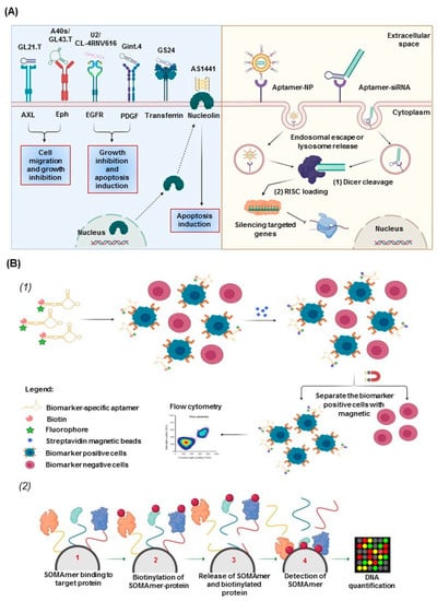 Aptamers as therapeutics and diagnostic tools. (A) Therapeutic aptamers alone (left panel) and aptamer-targeted drug delivery through receptor-mediated endocytosis (right panel): (1) dicer cuts the long double-strand RNA to form small interfering RNA (siRNA); (2) siRNA is loaded into of the RISC complex for further recognition, cleavage, and mRNA degradation. (B) Aptamers as diagnostic tools, as shown by (1) a schema of the OLIGOBIND strategy and (2) a schema of the SOMAscan (based on slow off-rate modified aptamer (SOMAmer) procedure for DNA quantification).