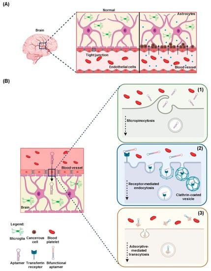 Mechanisms used by aptamers to penetrate the blood–brain barrier (BBB). (A) Left panel shows the normal BBB, in which the tight junctions are closed, blocking penetration through the BBB. Right panel shows tumor-induced BBB disruption, allowing penetration through opened tight junctions. (B) Proposed mechanism used by aptamers to cross the BBB: (1) micropinocytosis, (2): receptor-mediated endocytosis, and (3) adsorptive-mediated transcytosis through cell-penetrating peptide shuttles.