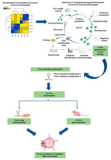 Given the unique repertoire of special characteristics such as target selectivity, high potential affinity, simplicity of modification, scalability, flexibility, low immunogenicity, and wide drug delivery platform, aptamers have emerged as an exciting and promising novel diagnostic and therapeutic tool for brain tumors [16]. Here we summarize the latest systematic evolution of ligands by exponential enrichment (SELEX) methods, post-selection modifications, and the use of aptamers as diagnostic and therapeutic agents.
