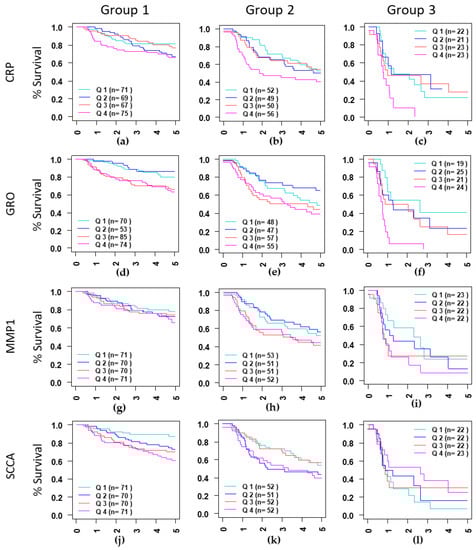 Kaplan-Meir curves curves for CPR (a–c), showing differences in survival in three groups identified based on stage (II and III) and treatment type (EBRT and EBRT+BT). Group 1: Stage II treated with EBRT+BT (a,d,g,j), Group 2: Stage III treated with EBRT+BT (b,e,h,k) and Group 3: Stage III treated with EBRT alone (c,f,i,l). serum level for each protein was divided into quartiles containing 25% of patients, Q1: Quartile 1 (0–25%), Q2: Quartile 2 (25–50%), Q3: Quartile 3 (50–75%) and Q4: Quartile 4 (75–100%). Quartile 1 was compared to Q2–Q3.