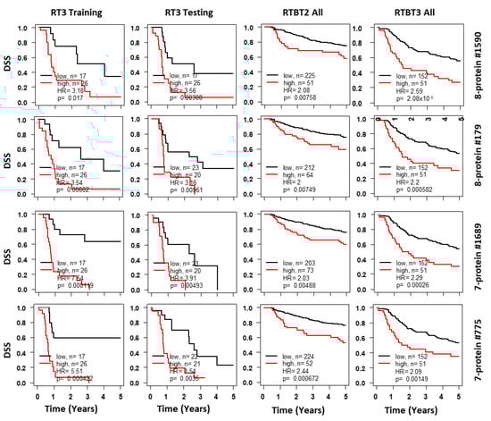 Kaplan-Meir curves for Ridge models developed with the RT3 dataset. Shown for each representative model are survival curves for the training subset (column 1), testing subset (column 2), validation in the RTBT2 (column 3) and RTBT3 datasets (column 4). Patients in each training subset were divided into high (40%) versus low (60%) for survival comparison and the cutoff threshold was applied to the testing and the independent RTBT2 and RTBT3 datasets. Results for selected protein models are presented here.