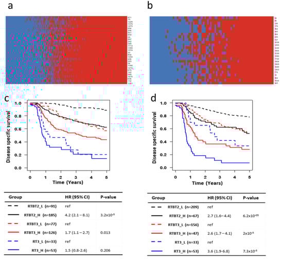 Because multiple models can potentially predict survival, it is essential to determine how consistently these different models classify each patient. Model consistency would be further evidence that the identified models are valid. Each model was used to assign each patient to either SASP-H or SASP-L group. The classification data for RTBT2 models on RTBT2 patients are summarized by the heatmap in Figure 4a, while the RTBT3 models on RT3 patients are summarized in Figure 4b.