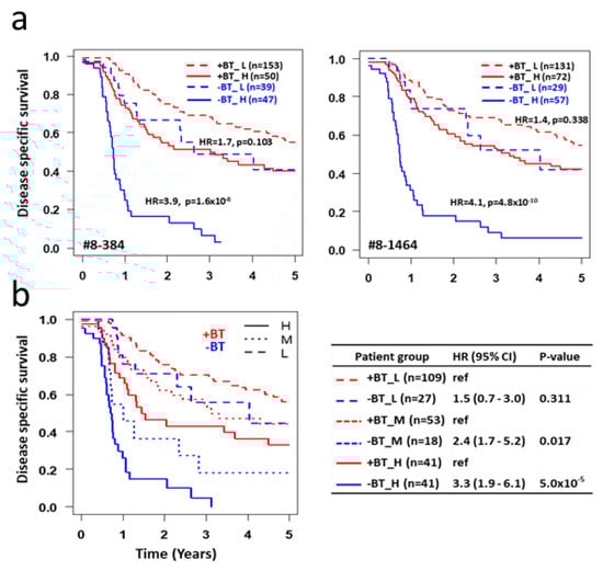 Using plurality voting of the 25 RT3 models, all stage 3 patients were classified into three SASP groups: H (>75% models voting high), L (>75% models voting low) and M (less 75% models voting either high or low). Consistent with the data from individual models, brachytherapy does not provide a significant survival benefit for SASP_L patients (HR = 1.5, p = 0.311), which represent 47% of all stage 3 patients, while brachytherapy does provide a significant survival benefit to SASP_H patients (HR = 3.3, p < 5 × 10−5) and SASP_M patients (HR = 2.4, p = 0.017) (Figure 5b).