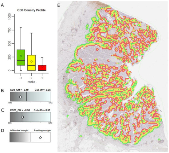 - Rasmusson, A.; Zilenaite, D.; Nestarenkaite, A.; Augulis, R.; Laurinaviciene, A.; Ostapenko, V.; Poskus, T.; Laurinavicius, A. Immunogradient Indicators for Antitumor Response Assessment by Automated Tumor-Stroma Interface Zone Detection. Am. J. Pathol. 2020, 190, 1309–1322. [Google Scholar] [CrossRef] [PubMed]