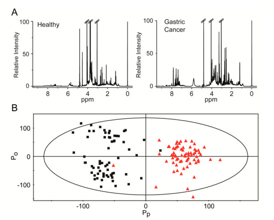 Representative 1H nuclear magnetic resonance (NMR) spectra of urine samples and discrimination between healthy control and gastric cancer groups. (A) Typical 1H NMR spectra with an internal standard signal (0.025% TSP) at 0 ppm. The left panel shows a representative 1H NMR spectrum for healthy controls, and the right panel shows a representative 1H NMR spectrum for patients with gastric cancer. (B) Orthogonal projections to the orthogonal projection for a latent structure-discriminant analysis (OPLS-DA) score plot of the healthy control and gastric cancer groups. The model was constructed with one predictive (Pp) and two orthogonal (Po) components. The overall goodness of fit and cross-validation coefficients are 86.5 and 72.8%, respectively. Black boxes: samples from healthy controls; red triangles: samples from patients with gastric cancer.