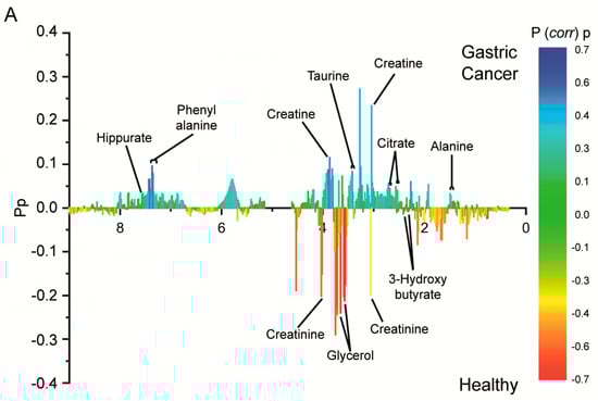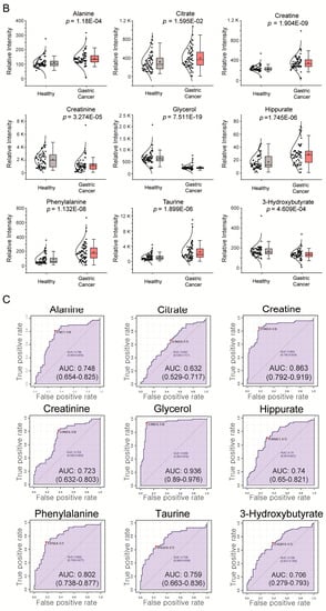 All metabolites with statistically meaningful differences were identified by matching their peak characteristics with those in databases and are shown in Figure 2A and Table S1. Of the identified metabolites, alanine, taurine, phenylalanine, and creatine have been previously described as urinary metabolomics markers for GC [31,32,33,37]. We observed low creatine and high creatinine levels in the urine from the normal subjects and, conversely, high creatine and low creatinine levels in the urine from the patients with GC (Figure 2B). The levels of these markers varied rather widely, with those of citrate showing the widest variation between the healthy control and cancer groups (Figure 2B). In addition, the fold increases were not very large, and thus it was difficult to find a single representative marker metabolite. As the (P corr) p-values of each signal in the S-TOCSY plot were also rather small (maximum value ≤0.7), multiple metabolites, rather than one or two major metabolites, seemed to intricately contribute to the group separation. Additionally, we performed a receiver operating characteristic (ROC) curve analysis, and the results showed a broad range of areas under the curves (AUCs), from 0.632 (citrate) to 0.936 (glycerol), with varying sensitivities and specificities (Figure 2C). The results of the ROC analysis are summarized in Table 2.