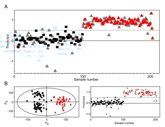 - Bylesjo, M.; Rantalainen, M.; Cloarec, O.; Nicholson, J.K.; Holmes, E.; Trygg, J. OPLS discriminant analysis: Combining the strengths of PLS-DA and SIMCA classification. J. Chemometr. 2006, 20, 341–351. [Google Scholar] [CrossRef]